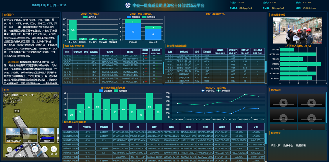 系統(tǒng)對梁廠生產(chǎn)安全、質(zhì)量、進度、監(jiān)測、人員考勤、以及日常等數(shù)據(jù)進行分析統(tǒng)計并在大屏上動態(tài)展示