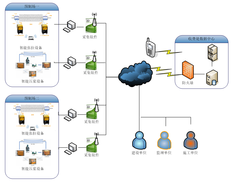 系統(tǒng)由數(shù)據(jù)采集客戶端、數(shù)據(jù)傳輸客戶端、平臺(tái)服務(wù)端、移動(dòng)接收終端軟件共同組成。對(duì)張拉壓漿過(guò)程數(shù)據(jù)及結(jié)果數(shù)據(jù)進(jìn)行自動(dòng)采集,生成相應(yīng)的記錄報(bào)表或報(bào)告。系統(tǒng)將各項(xiàng)數(shù)據(jù)進(jìn)行實(shí)時(shí)同步傳輸至質(zhì)量動(dòng)態(tài)監(jiān)控平臺(tái),一旦發(fā)生張拉或壓漿數(shù)據(jù)偏差或質(zhì)量問(wèn)題,系統(tǒng)能夠自動(dòng)預(yù)警并發(fā)送手機(jī)短信至相關(guān)管理者。