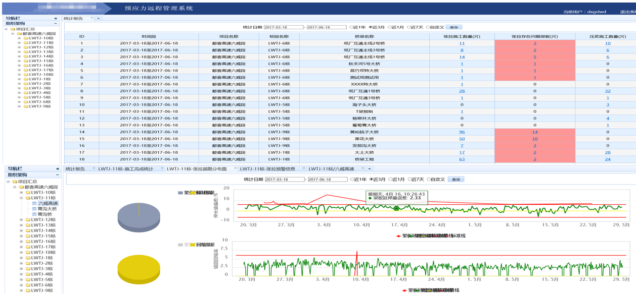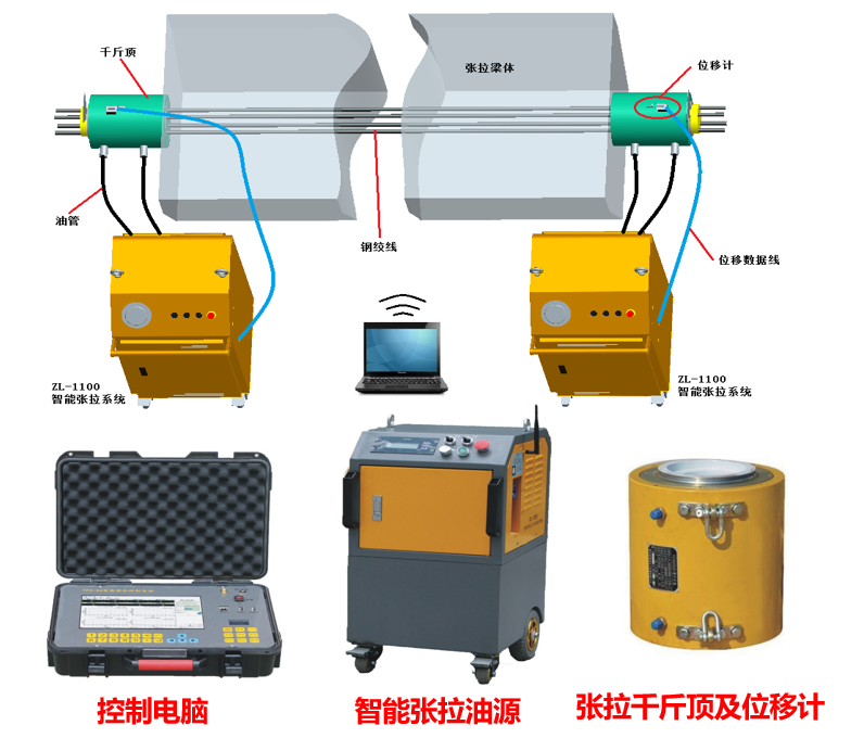 智能預(yù)應(yīng)力張拉由兩個(gè)伺服油源系統(tǒng)、智能型穿心式液壓千斤頂、數(shù)據(jù)信號(hào)線、高壓油管、高精度壓力傳感器、位移傳感器、控制電腦、操作控制系統(tǒng)軟件等構(gòu)成,控制電腦與伺服油源系統(tǒng)之間通過(guò)無(wú)線通訊模塊進(jìn)行數(shù)據(jù)傳輸通迅。 系統(tǒng)對(duì)每次張拉位置、張拉時(shí)間、張拉伸長(zhǎng)量、誤差、是否合格等數(shù)據(jù)進(jìn)行詳細(xì)記錄。對(duì)于出現(xiàn)數(shù)據(jù)超標(biāo)或不合格情況,立即已手機(jī)短信報(bào)警的形式發(fā)送給相關(guān)管理者。系統(tǒng)對(duì)超標(biāo)數(shù)據(jù)進(jìn)行歸類統(tǒng)計(jì),繪制超標(biāo)數(shù)據(jù)統(tǒng)計(jì)分析,超標(biāo)數(shù)據(jù)標(biāo)識(shí)為紅色。 |