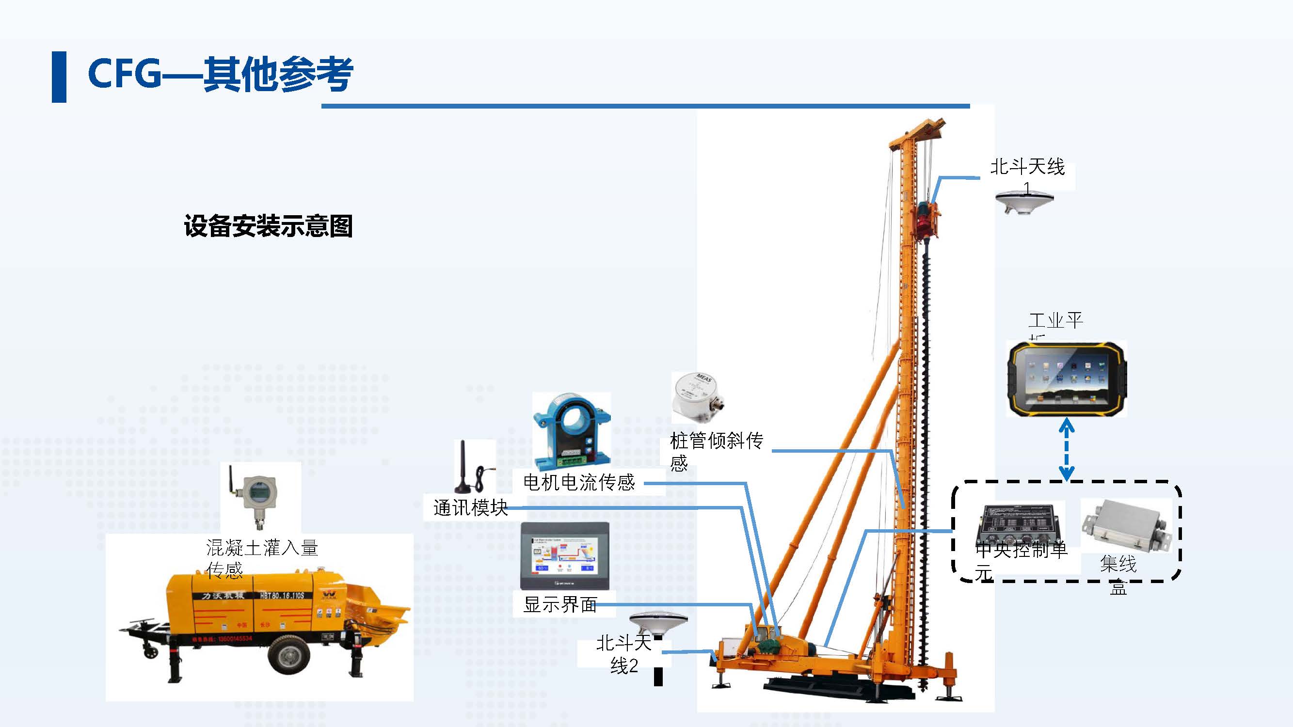北斗定位模塊:通過(guò)兩個(gè)天線(xiàn)的精準(zhǔn)定位可以判斷 CFG 樁機(jī)方位,方向,CFG 樁機(jī)樁桿位置以及樁機(jī)所在地表高程。